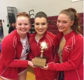 Red Star Seniors Madelyn Moedebeck, Olivia Bollhorst and Morgan Torre accept the Linda Lannie Traveling Trophy for Sportsmanship presented at The NH State Championhips on April 13, 2019